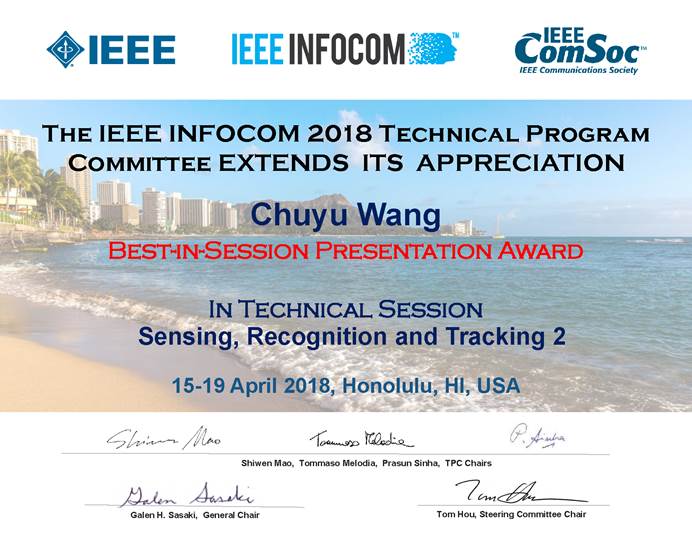 INFOCOM是由IEEE组织的通信网络领域的国际盛会,和MOBICOM和SIGCOMM同为中国计算机学会推荐的计算机网络方向的A类会议,为全球计算机网络领域的学者提供了很好的展示舞台和交流平台。本届INFOCOM共收到来自世界各地的1606篇投稿,录用的正式会议论文共309篇,录用率为19.2%。大会中每个Session产生一个Best-in-Session Presentation Award。该奖项的设立旨在提高论文汇报质量,提升参会者体验,保证会议交流水平。各Session主席邀请至少4个TPC成员到场并为论文汇报人的展示进行严格打分,最后得分最高者获此奖项。