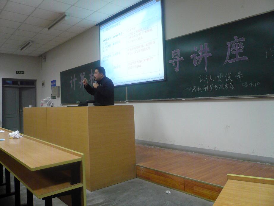费老师在讲座中,结合计算机系本科生的专业特点,用“游戏”的比喻生动、形象地展示了大学本科四年的学习过程。通过向在座的同学们介绍“为什么大学这场游戏要通关”、“大学是什么”、“大学生的任务”、“怎样通关——练级”等问题,就同学们进校后面临的心态、学习、生活、社会交往等方面的变化及相关问题进行了逐一的解答和指导,帮助同学们明确目标,寻找实现自我的最佳方案。费俊峰老师的讲座深入浅出,内容丰富,为大一同学更好地适应大学生活提供了有益的指导,受到我系07级学生的热烈欢迎!