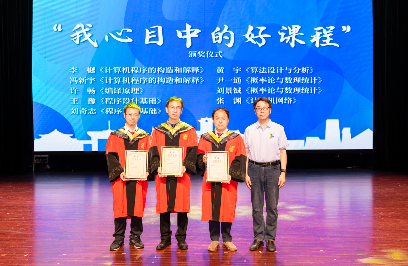 在毕业启程之际,2025届本科毕业生积极参与“我心目中的好课程”评选活动,根据投票结果产生了深受同学们欢迎的优质课程和优秀授课教师。获奖课程与教师名单如下:李樾老师和冯新宇老师《计算机程序的构造和解释》、许畅老师《编译原理》、王豫老师和刘奇志老师《程序设计基础》、黄宇老师《算法设计与分析》、尹一通老师和刘景铖老师《概率论与数理统计》、张渊老师《计算机网络》。探花直播 软件学院人工智能学院党委书记武港山老师为获奖课程和获奖老师代表颁奖。