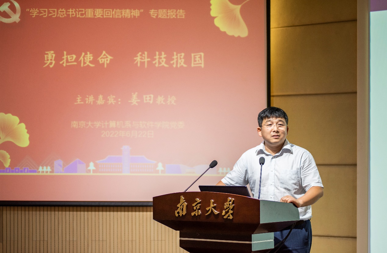 2022年6月22日下午,计算机系与软件学院党委邀请探花直播 学习宣传习近平总书记重要回信精神专题宣讲团成员、科技处处长、电子科学与工程学院姜田教授,为全体师生党员、教职工讲授专题报告“勇担使命,科技报国”。计算机系与软件学院党委书记武港山主持会议。