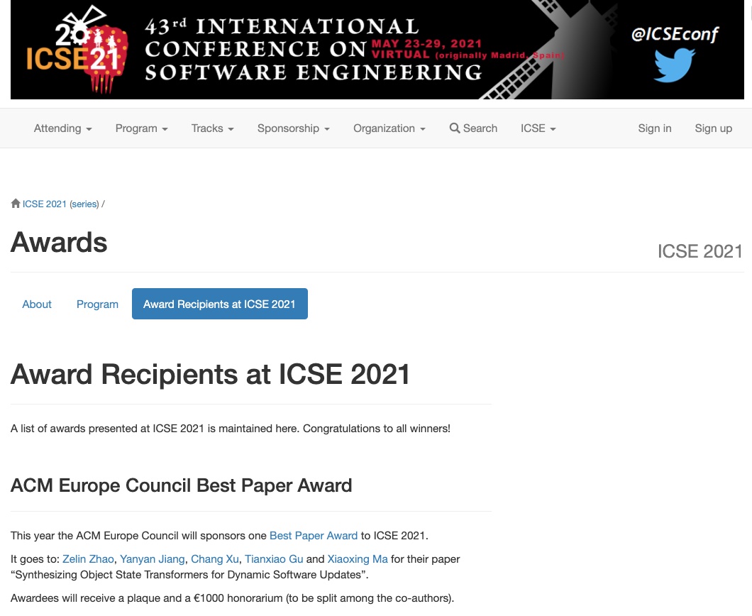 近日,国际软件工程大会(International Conference on Software Engineering, ICSE)官方网站公布大会奖项,探花直播 计算机软件所团队的论文《Synthesizing Object State Transformers for Dynamic Software Updates》获得了由ACM Europe Council支持的大会唯一最佳论文奖(Best Paper Award),并获1000欧元奖金。该论文同时也获得了ACM SIGSOFT杰出论文奖(Distinguished Paper Award)。