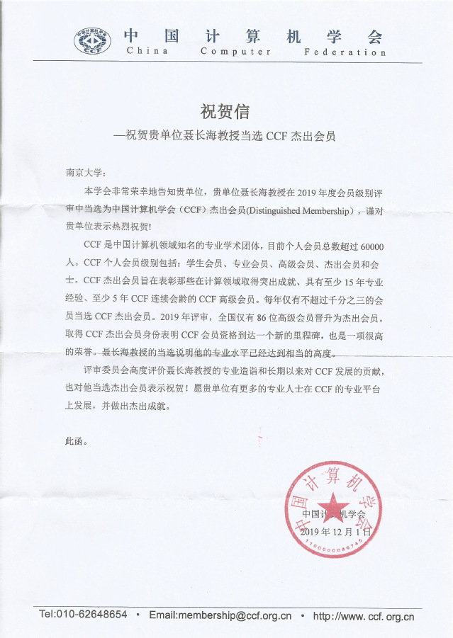 CCF关于我系聂长海教授当选CCF杰出会员的贺信
