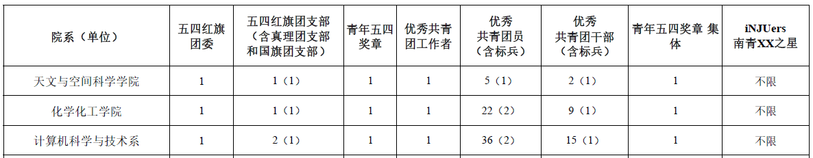 学校团委已发布2018年度五四评优通知,根据文件,我系各类评优可推荐名额为:
