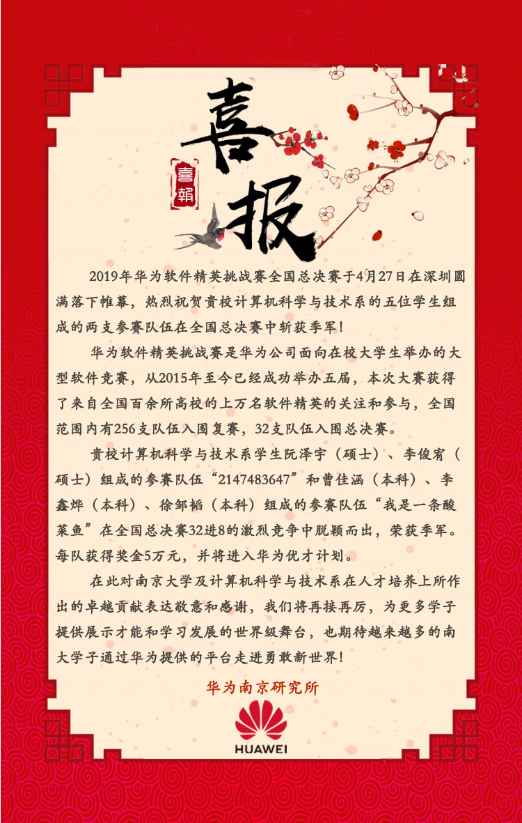 2019年华为软件精英挑战赛全国总决赛于4月27日在深圳落下帷幕。探花直播 计算机科学与系的5位同学组成的两支参赛队伍在全国总决赛中斩获季军!华为技术有限公司向我系发来喜报,对我系在人才培养上所作出的卓越贡献表达敬意和感谢。