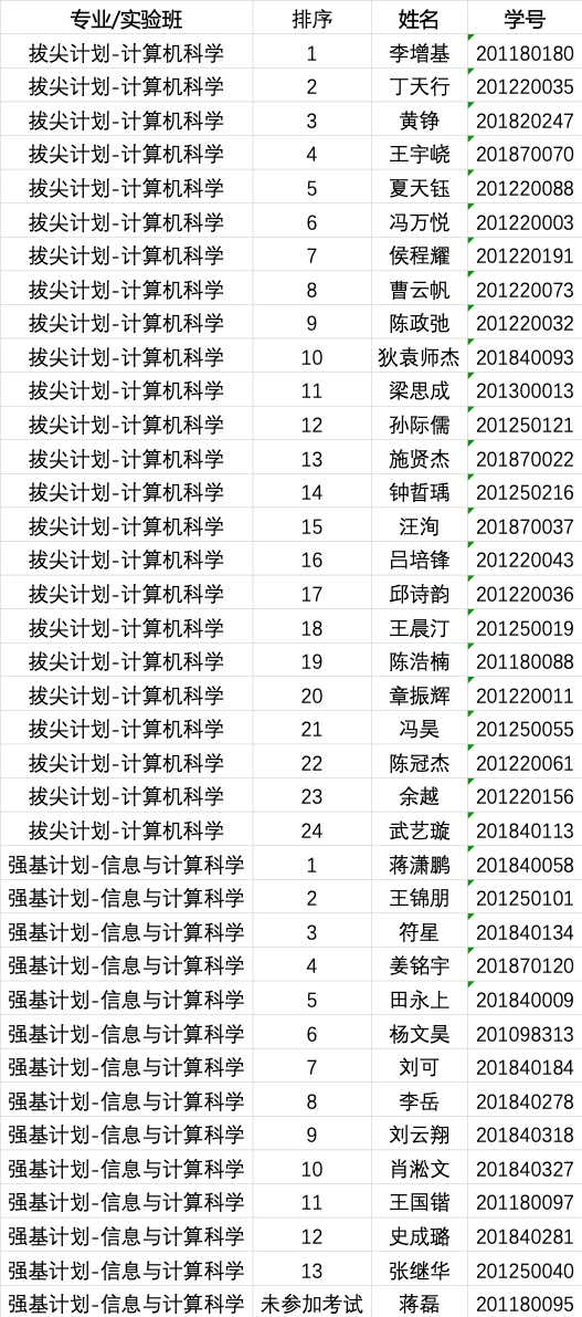 根据探花直播 2020级本科生二次选拔方案,进入拔尖计划(计算机)/强基计划(信息与计算科学)复试考核的学生最终成绩排序公布如下,其中,拔尖计划(计算机)排序前20名、强基计划(信息与计算科学)排序前13的学生拟进入预录取名单。请进入拟录取名单的同学于9月15日17点前至计算机系楼附楼541马骏老师处签订确认书。最终预录取名单以学校公布为准。